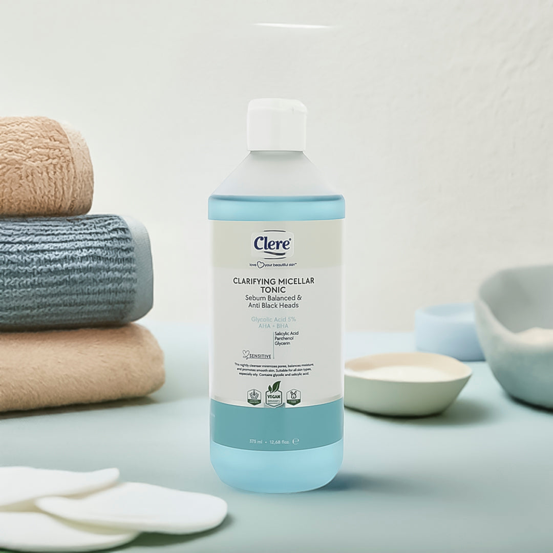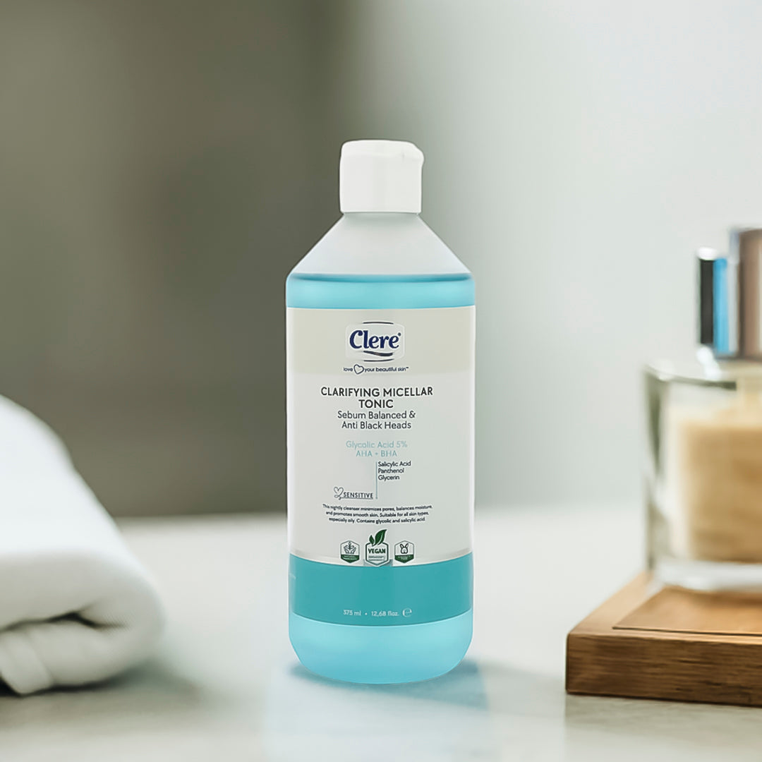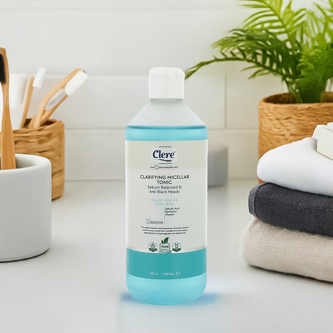 Clere Clarifying Micellar Tonic 375ml – Mit 5% Glycolsäure & Salicylsäure, Porentiefe Reinigung, Sebum Kontrolle, Anti-Mitesser, Vegan & Cruelty-Free, für Fettige und Unreine Haut